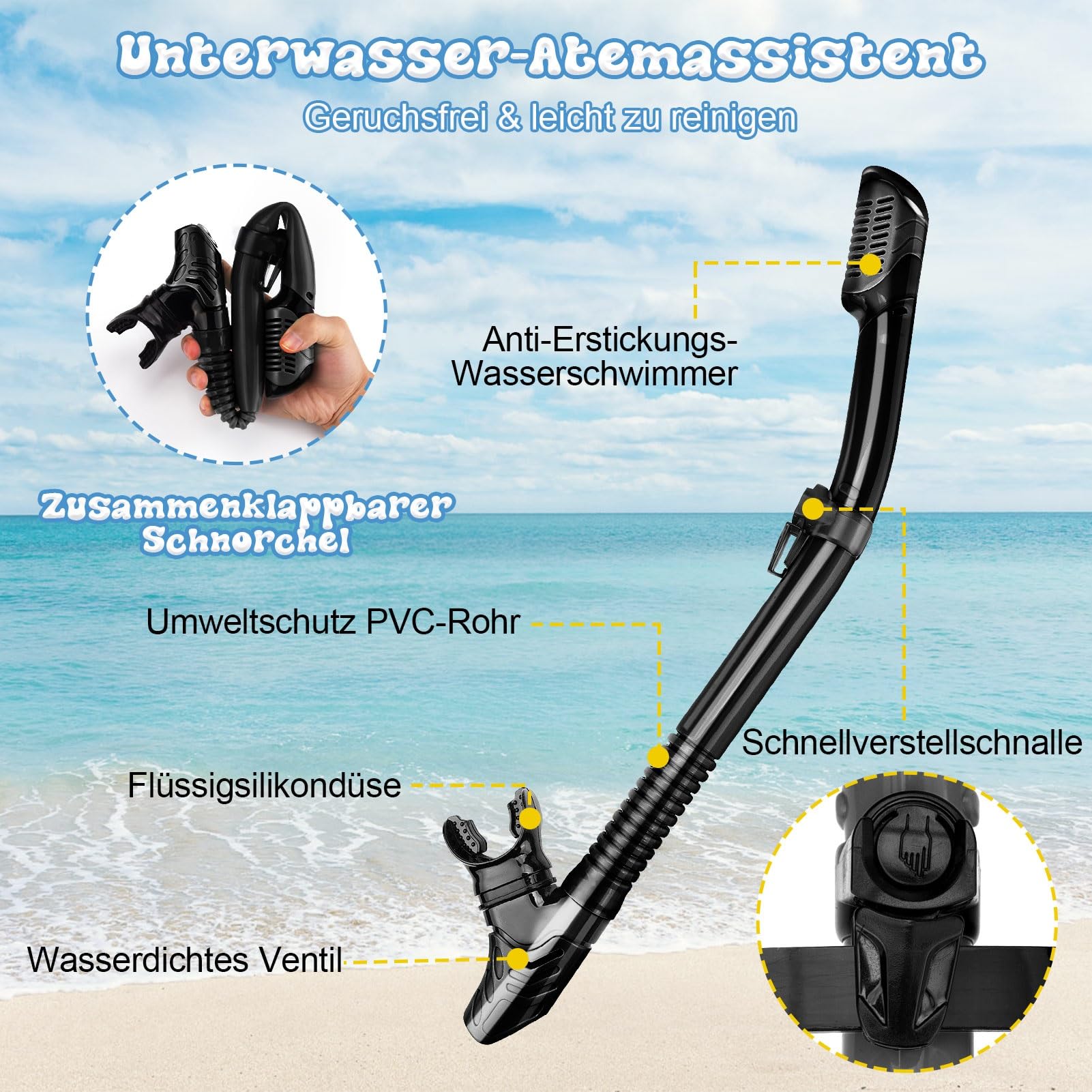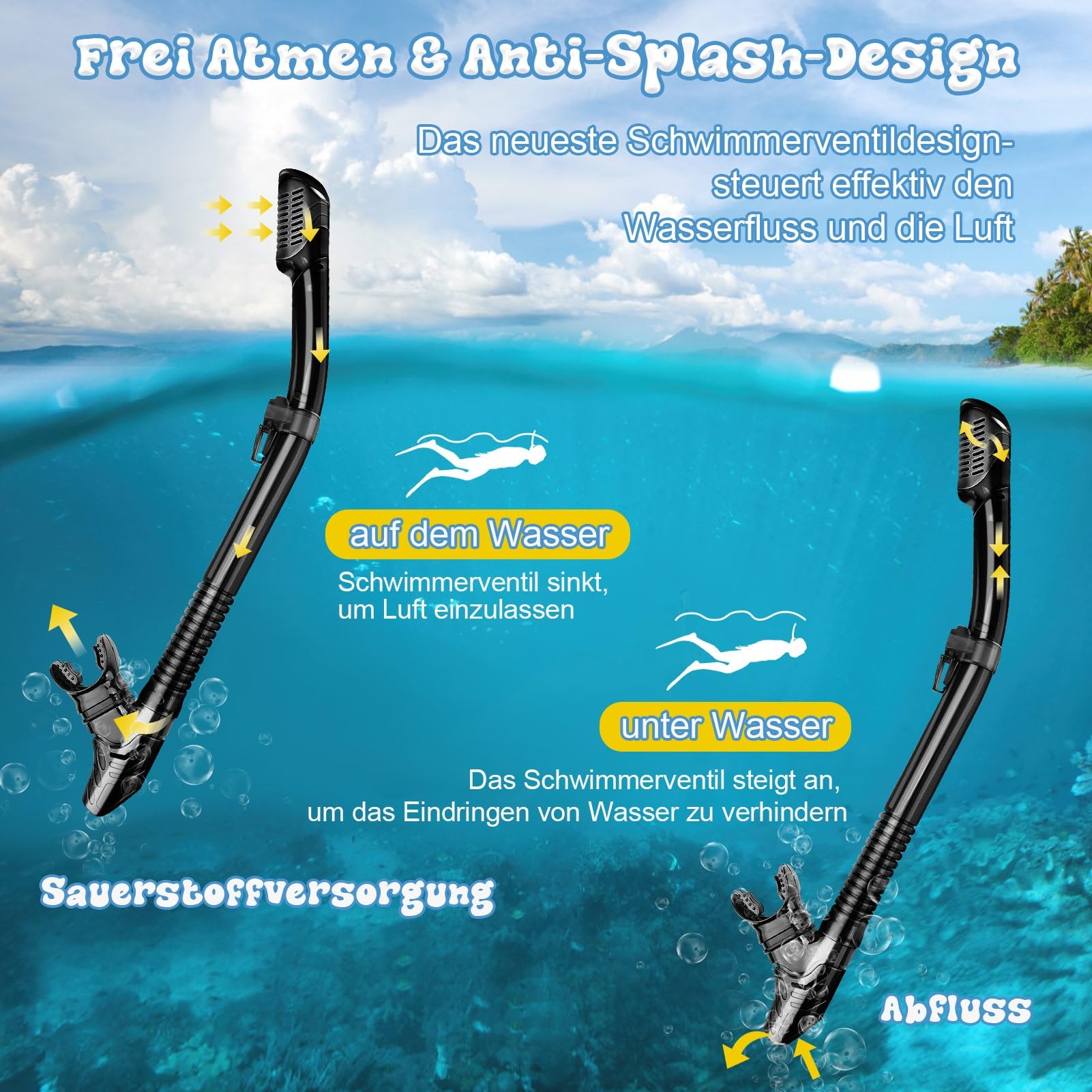 - 🌊 [Leicht zu atmendes Trocken Schnorchelset] - Der kollabierbare Atemschlauch nimmt an der Öffnung ein automatisches Schließventil an. Wenn er aus dem Wasser auftaucht, wird sie wieder geöffnet. Der Spritzschutz verhindert, dass Wasser in den Schnorchel eindringt, selbst wenn die Wellen über ihnen brechen. Und das Ventil wird nicht durch kleinen Sand oder andere Gegenstände stecken bleiben. Das Silikon-Mundstück ist ergonomisch geformt für Komfort und Langlebigkeit.