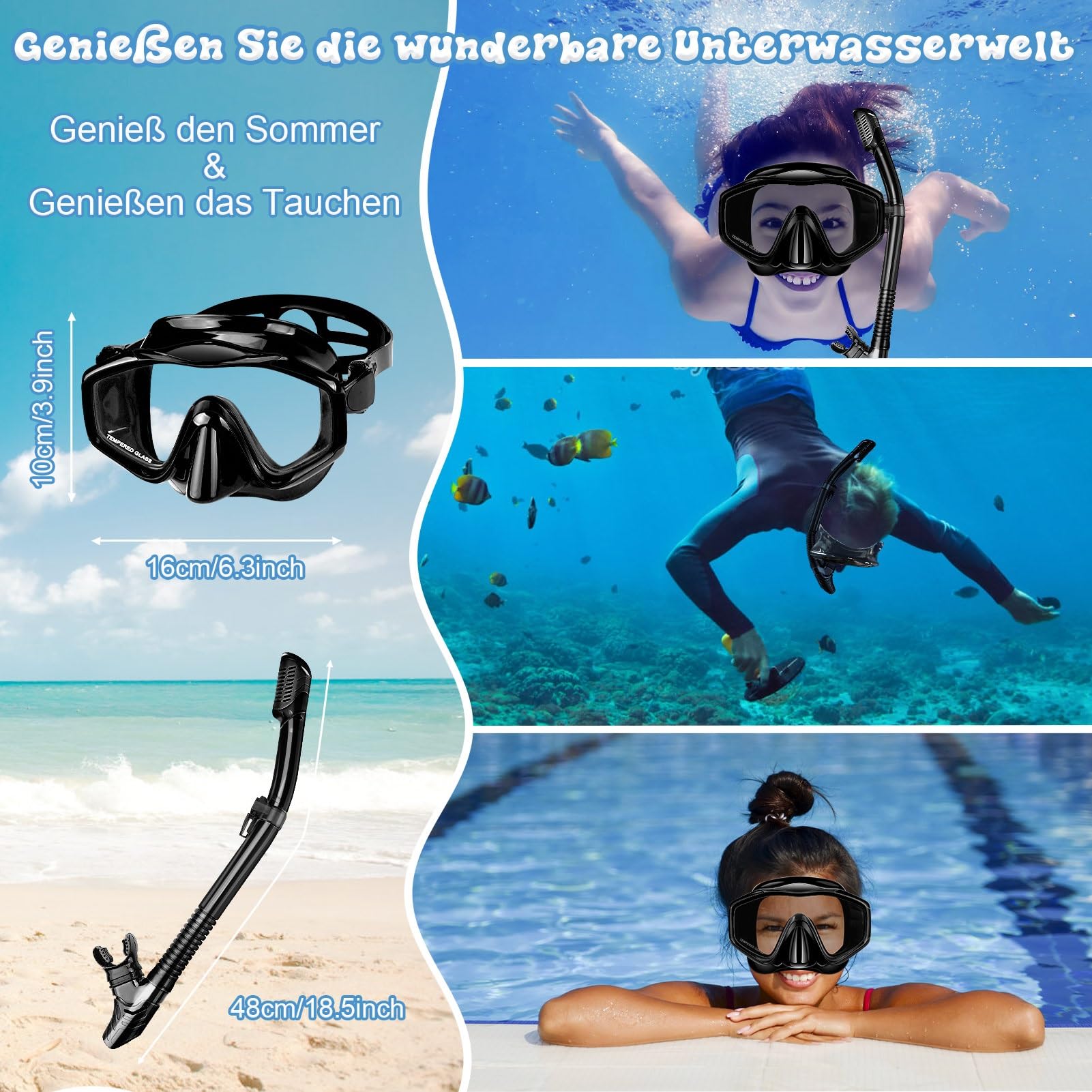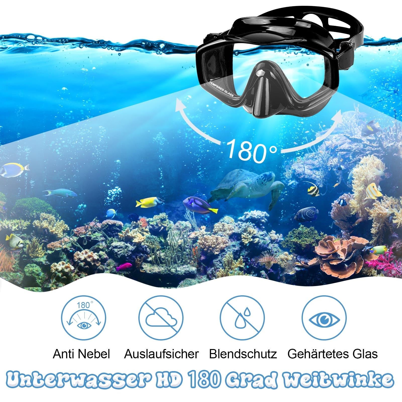 - 🌊 [Anti-Leck- und Antibeschlag-Technologie] - Das dreischichtige Linsendesign, verstärktes gehärtetes Glas am Seitenfenster und eine spezielle Antibeschlagbehandlung können Ihnen dabei helfen, die kristallklare Unterwasserwelt glücklich zu erkunden. Die weiche und hautfreundliche Silikonkante hat ein doppellagiges wasserdichtes Design, um sich optimal an verschiedene Gesichtsformen anzupassen und ein Auslaufen von Wasser zu vermeiden.