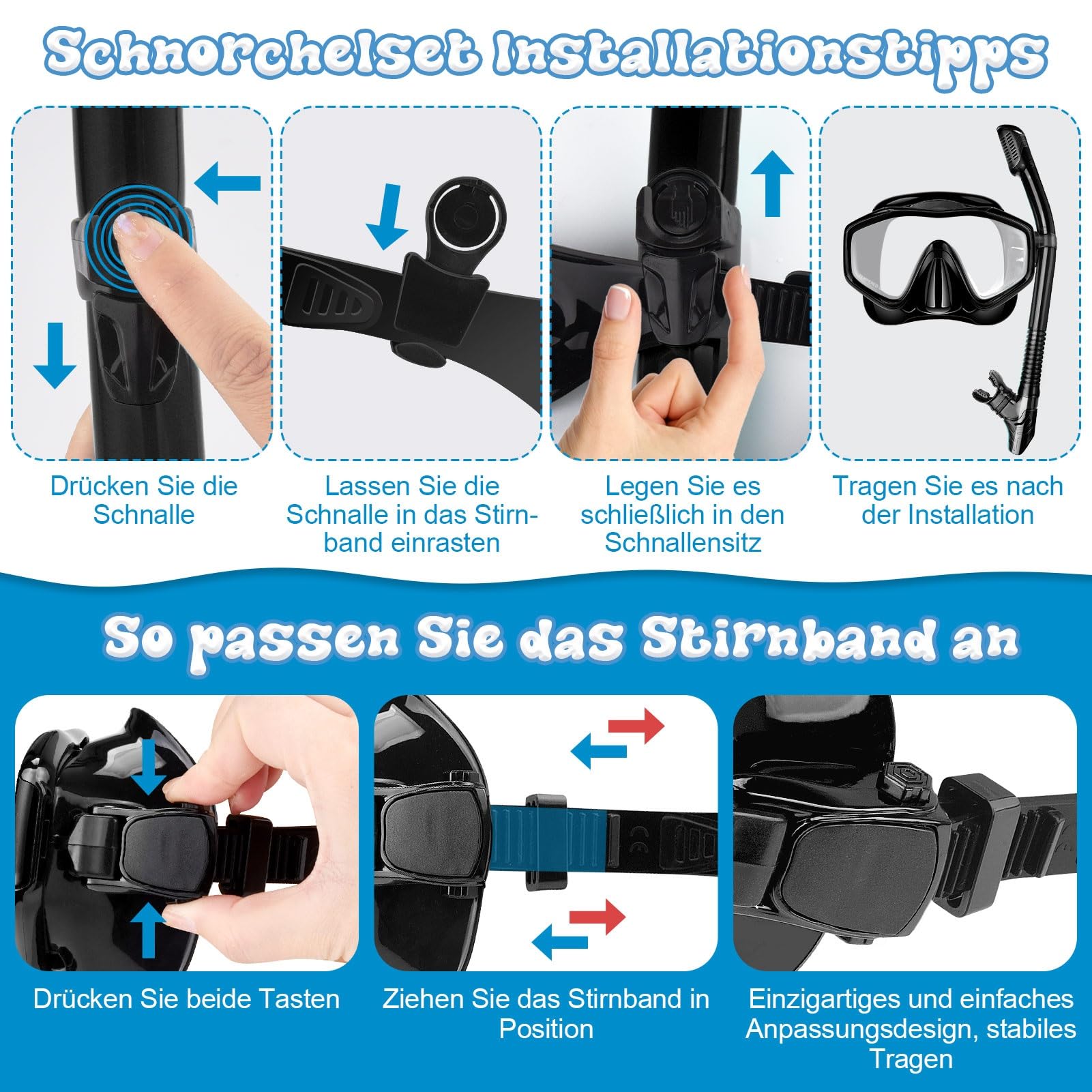 - 🌊 [Verstellbares Kopfband] - Tauchmaske besteht aus klarem Silikon in Lebensmittelqualität, das weich und bequem ist. Das Schnorcheln Set verfügt über ein verstellbares gezacktes Stirnband, das sich ganz einfach in der Länge an alle Kopfgrößen und unterschiedliche Gesichtsformen anpassen lässt. Der Maskenbandclip ist mit einem Schnellverschluss ausgestattet (einfach leicht drücken), um den Schnorchel und die Schnorchelmaske schnell zu lösen.