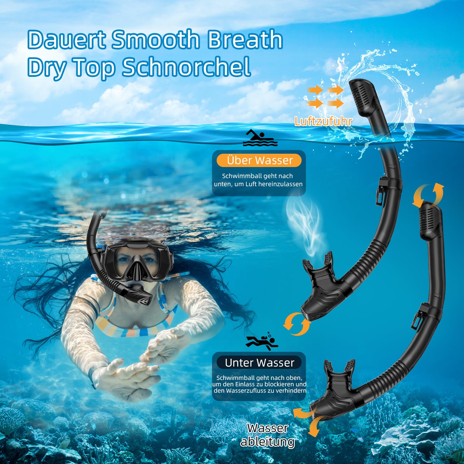 - 【Leicht zu atmender trockener Schnorchel】 Der Schnorchel ist ein wichtiger Teil der Schnorchelausrüstung, mit dem Sie mit dem Gesicht nach unten auf der Wasseroberfläche atmen können, damit Sie so viel wie möglich im magischen Moment bleiben können. Die Oberseite des Schnorchels verfügt über ein schwimmendes Ventil, das unter Wasser vollständig abgedichtet ist, das Eindringen von Wasser verhindert und sich an der Wasseroberfläche öffnet, damit Sie leicht atmen können.