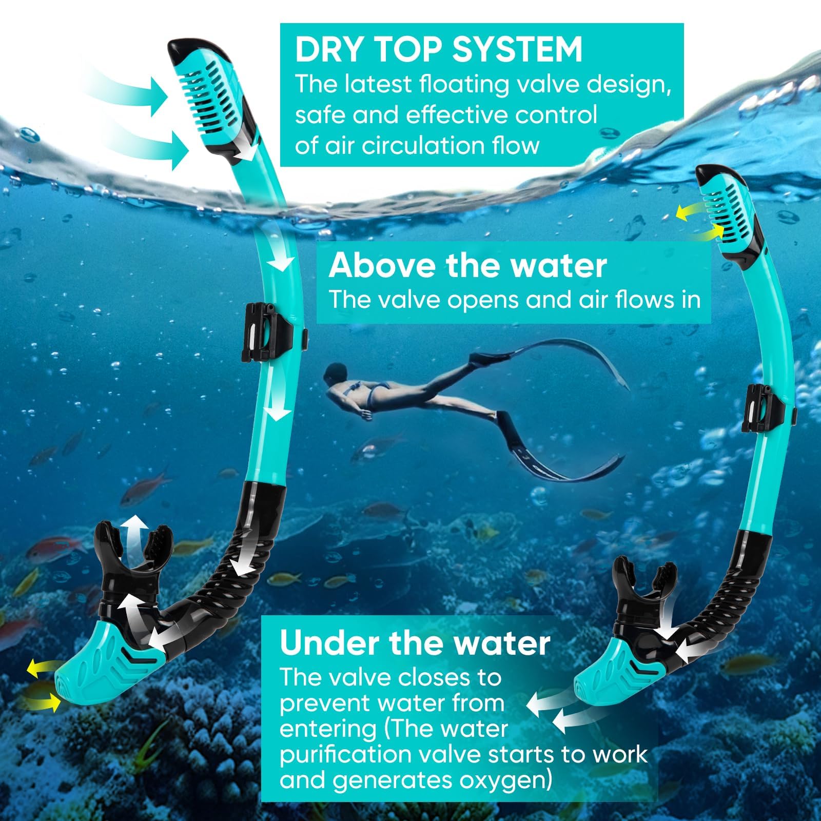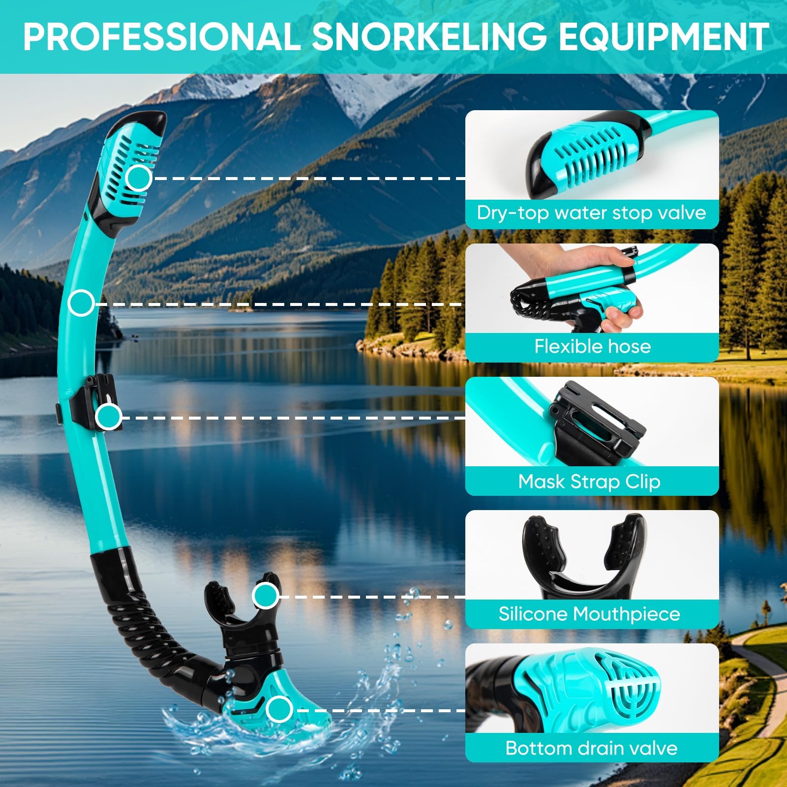 - TROCKENSCHNORCHEL MIT AUSLASSVENTIL: Der abnehmbare Schnorchel verfügt über ein zuverlässiges Trockenventil, das das Eindringen von Wasser verhindert. Das Auslassventil am unteren Ende sorgt für schnelles Entleeren. Ergonomisches Silikonmundstück für bequemes und sicheres Atmen